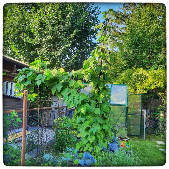 Die Bohne kommt als Busch- oder Stangenbohne auf die Welt. Wobei die Buschbohne tatsächlich am Busch hängt, die Stangenbohne jedoch keineswegs an der Stange. Das sagt man nur so, weil sich die Bohnenranken gerne an Stangen dem Himmel entgegen ranken. Sie ranken sich aber auch an allem anderen entlang, was sonst irgendwie einen Weg nach oben verspricht. Da sind sie nicht wählerisch.