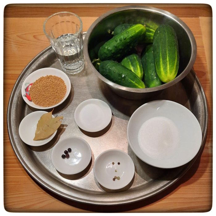 Die Zutaten werden kurz aufgekocht, dann werden die geschälten, entkernten und klein geschnittenen Gurken hinzu gegeben und kurz mit gekocht. Sud und Gurken kommen anschließend in ein Einmachglas. Abkühlen lassen.