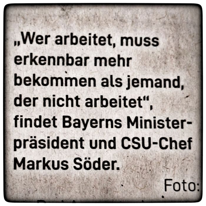Da möchte ich dem Suder Söder aus tiefstem Herzen zustimmen. Da möchte ich mit ihm Arm in Arm durch die Gassen laufen und für gerechte Entlohnung streiten. Würde mit ihm zusammen den Mindestlohn anheben. Würde den Beamtentarif der untersten Besoldungsklassen auf ein menschenwürdiges Niveau bringen. Ich würde mit ihm einmütig all die Renditen abschöpfen, die von arbeitsscheuen Spekulanten aus den Börsen der Arbeiter, Mieter und Kreditnehmer gepresst werden. Ich würde mit ihm brüderlich für eine gerechte Gesellschaft streiten.