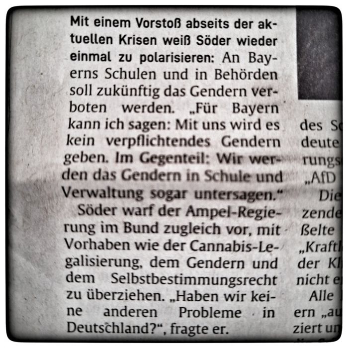 Wir haben in Bayern einen echten Bildungsnotstand. Der hat seinen Ursprung tief in den 70ern und führt zu dramatischen Situationen dieser Tage. Eine von Bildung scheinbar völlig unbeleckte Regierung unter Leitung eines ebenso bildungs- wie intelligenzfernen Ministerpräsidenten ist der festen Überzeugung, des erwiesenermassen inkompetenten und vorsintflutlichen Bildungswesens mit dem Verbot von Gendern beikommen zu können.