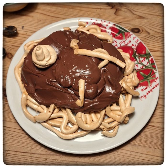 Auf dem Bild ist ein Nest aus Baiser zu sehen, das mit Schokopudding gefüllt ist. Und auch wenn es aussieht wie ein Beitrag von "Worst of Chefkoch" hat es sehr lecker geschmeckt.
