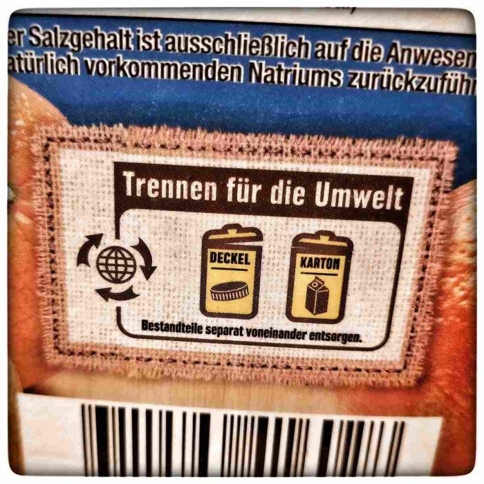 Letztlich war es jedoch nur ein Stückchen Plastik extra. Ein Stückchen, das nach einmaliger Nutzung entsorgt und verbrannt werden musste. Das stößt dem mülltrenngewohnten Verbraucher natürlich auf. Und schon mahlen die Mühlen des geschickten Marketings. Nein, es werden nicht die überflüssigen Kunststoffverschlüsse weg gelassen, vielmehr wird der Verbraucher aufgefordert, den Verschluss vom Karton zu trennen und getrennt zu entsorgen.