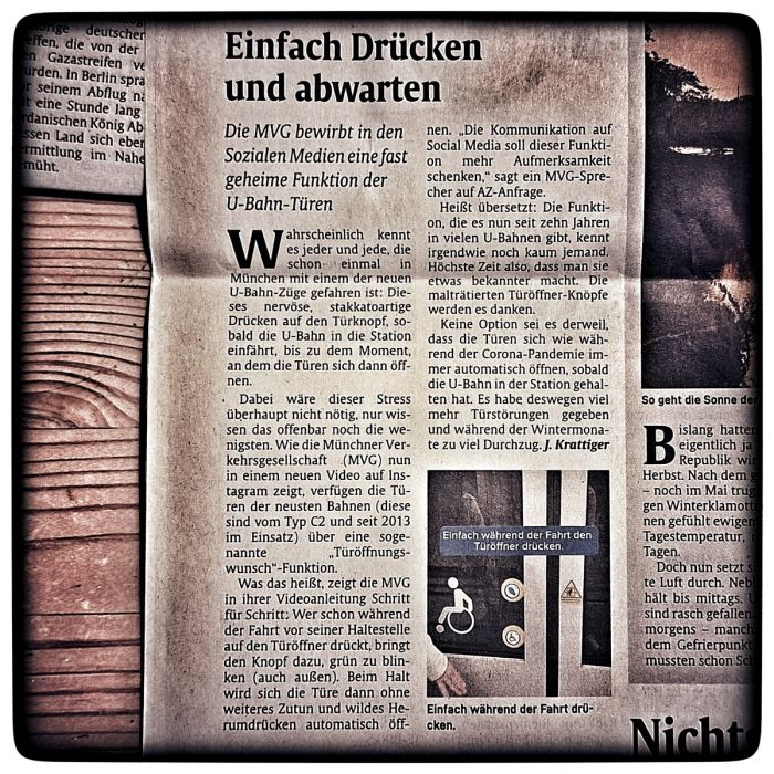 Nicht so beim MVV. Da geht man einen anderen, moderneren Weg. Man integriert in den Knopf nämlich ein weiteres Feature: Den Türöffnungswunsch. Drückt man also den Knopf zu einem beliebigen Zeitpunkt dann öffnet sich die Tür an der nächsten Haltestelle. Automatisch. Ganz ohne dass man verzweifelt auf den Knopf herumdrücken muss.