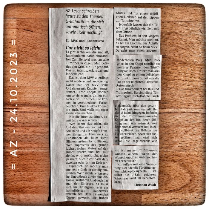 [UPDATE]: Die Abendzeitung fand meinen Beitrag einmal mehr der Veröffentlichung für würdig. Ich mache mir langsam Gedanken darüber, ob ich nicht schon zu sehr im Mainstream angekommen bin. Wobei, nein, eigentlich mache ich mir keine Gedanken darüber.