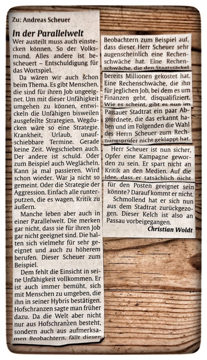 Wie es scheint, gibt es nun im Passauer Stadtrat ein paar Abgeordnete, die das erkannt haben und im Folgenden die Wahl des Herrn Scheuer zum Rechnungsprüfer nicht geklappt hat.