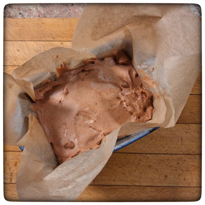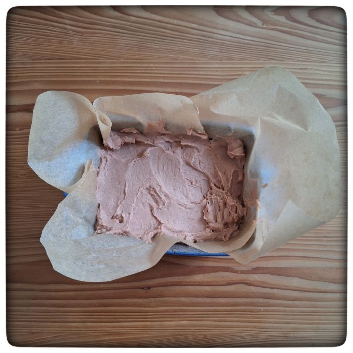 Ab in die Backform und in den Kühlschrank. 30 bis 60 Minuten soll der Teig ruhen und quellen. Je länger, desto fester wird das Endprodukt, so ist zu lesen. Ich denke, ich entscheide mich für die Mitte: 45 Minuten.