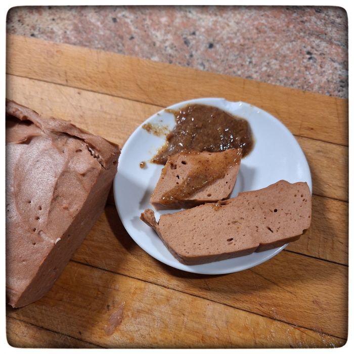 Ich bin ja experimentierfreudig. Auch in Sachen vegane Nahrungsmittel. Erbsenburger gibt es in ganz gut uns ganz greislich. Weißwurstersatzdinger sind ganz gruselig. Heute also Leberkäse.