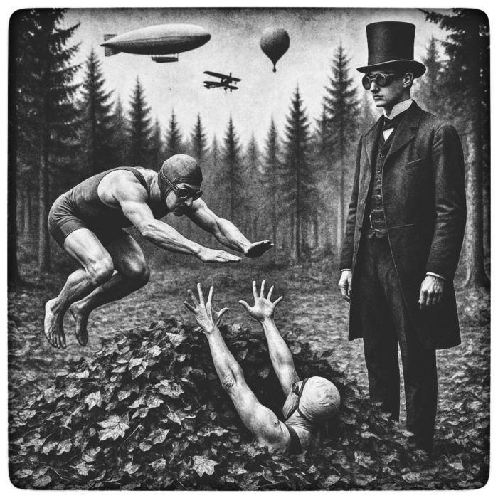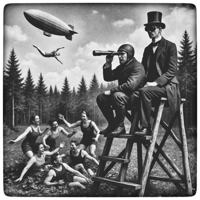Waldbademeister beobachten das lustige Treiben im Waldbad. Ist das Laub warm genug. Tollen die Buben und Mädchen nicht zu wild. Springt jemand vom Beckenrand (verboten) aus dem Luftschiff (erlaubt).