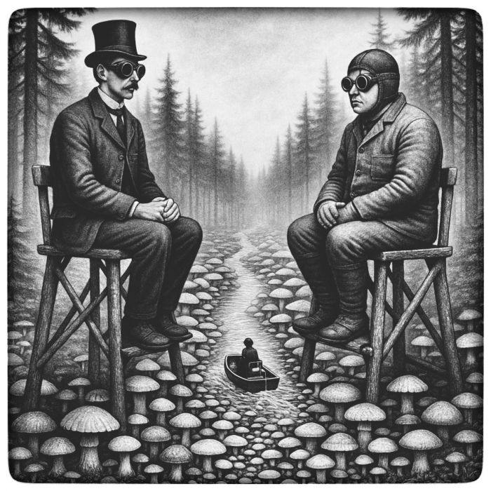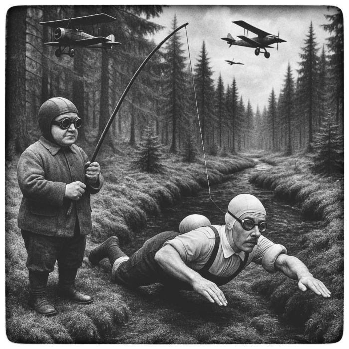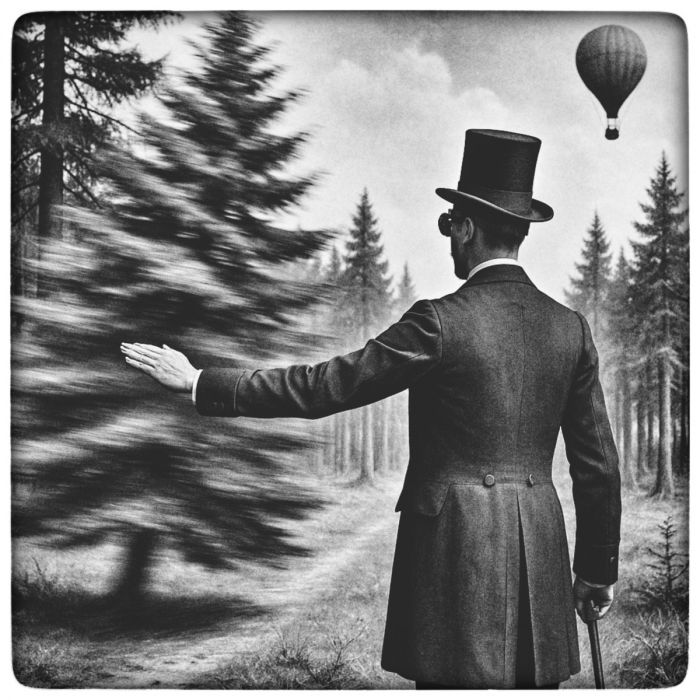 Nicht zuletzt sorgen Waldbademeister für die Einhaltung der Waldverkehrsregeln. Hier ist der Meister zu sehen, wie er für das rasche und gefahrlose Queren eiliger Tannen sorgt.