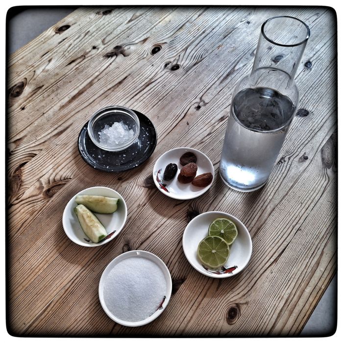 Jetzt sitze ich in der Küche vor einem kleinen Glas gefüllt mit Wasser und mit... ja, mit was denn. Wasserkefirkristalle sollen das sein.