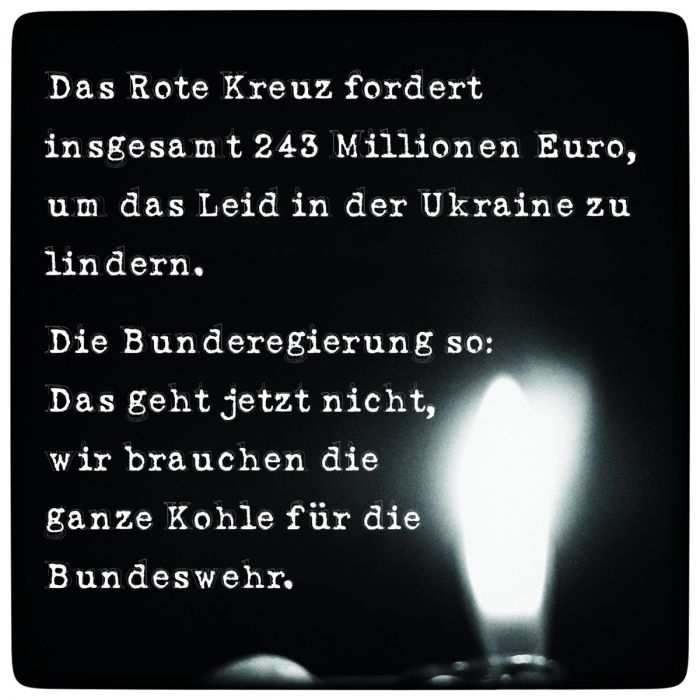 An allen Ecken und Enden fehlt uns hierzulande Geld. In der Pflege, bei der Energiewende, im Öffentlichen Nahverkehr, was weiß ich noch alles. Und jetzt - zack - so ganz nebenbei mal 100 Milliarden Ocken für die Bundeswehr bereit gestellt. Wow, das sind über 20% der Gesamtausgaben des Bundes. Und das zusätzlich zu den schon geplanten 50,3 Milliarden Euro (entspricht etwa 9% des Bundeshaushalts)(2)(3). Da wandern unsere Steuern in Rüstung und das nicht zu knapp. Das Geld ist futsch. Und wenn sich die Bundeswehr erst an diesen Geldsegen gewöhnt hat, dann werden uns diese Ausgaben die nächsten Jahre begleiten.