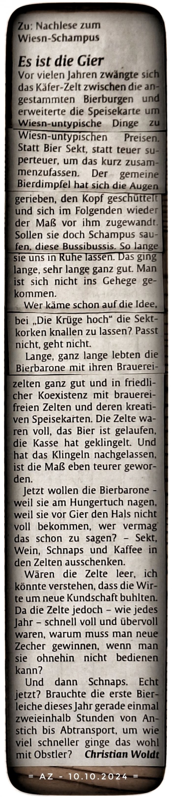 Jetzt wollen die Bierbarone - weil sie am Hungertuch nagen, weil sie vor Gier den Hals nicht voll bekommen, wer vermag das schon zu sagen - Sekt, Wein, Schnaps und Kaffee in den Zelten ausschenken.