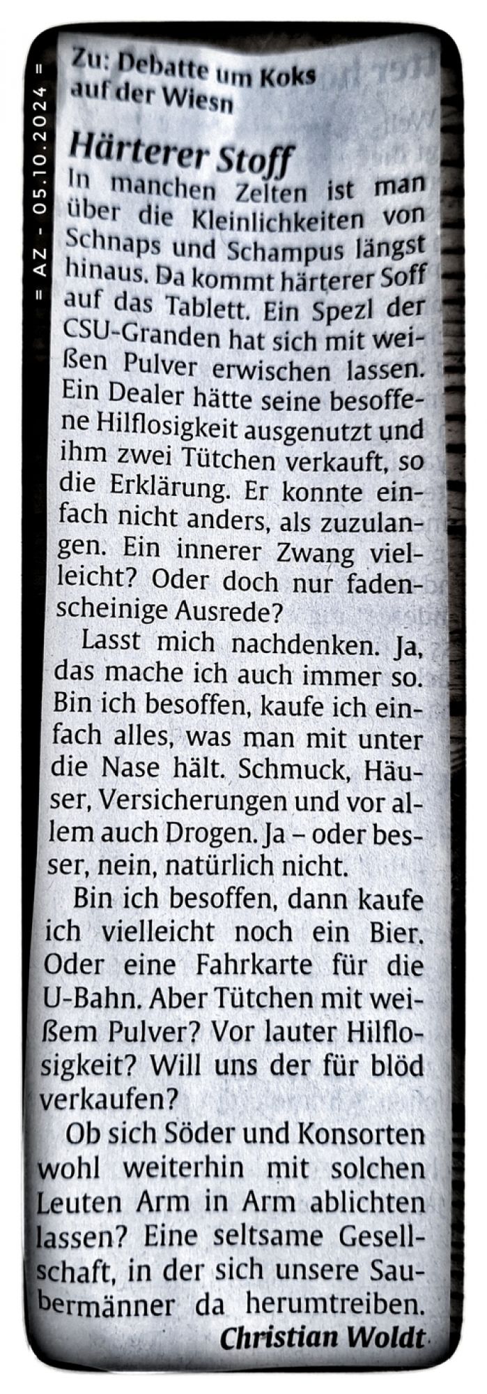 Ein Spezl von den CSU Granden hat sich mit weißen Pulver erwischen lassen. Ein Dealer hätte seine besoffene Hilflosigkeit ausgenutzt und ihm zwei Tütchen verkauft, so die Erklärung. Er konnte einfach nicht anders, als zuzulangen. Ein innerer Zwang vielleicht? Oder doch nur fadenscheinige Ausrede.