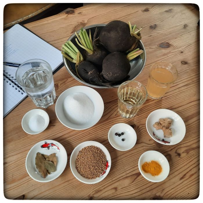 So ein Winterrettich eignet sich ganz prima, um dann ausgesät zu werden, wenn anderes Gemüse - zum Beispiel die Bohnen - bereits abgeerntet sind. Wenn man denn eine Hand voll Samen in der Erde verteilt, dann wird da eine Hand voll Pflanzen draus. Und an jeder Pflanze hängt ein paar Monate später eine Knolle. Oder Wurzel. Egal. Jedenfalls ist die Ernte dann so reichhaltig, dass man schnell ins Grübeln kommt, was denn nun mit dem Rettich passieren soll. Man will ja nicht wochenlang tagein, tagaus geschnittenen und gesalzenen Rettich essen. Auch als Salat - mit ein wenig Zucker und Sahne verfeinert - ist man dem schnell über.