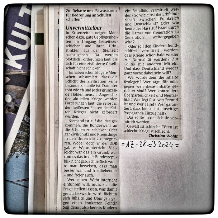 Oder soll den Kindern feindbildfrei vermittelt werden, dass Krieg schon bald zum Normalfall wird? Zur Politik mit anderen Mitteln. Und dass Deutschland wieder ganz vorne dabei sein will?